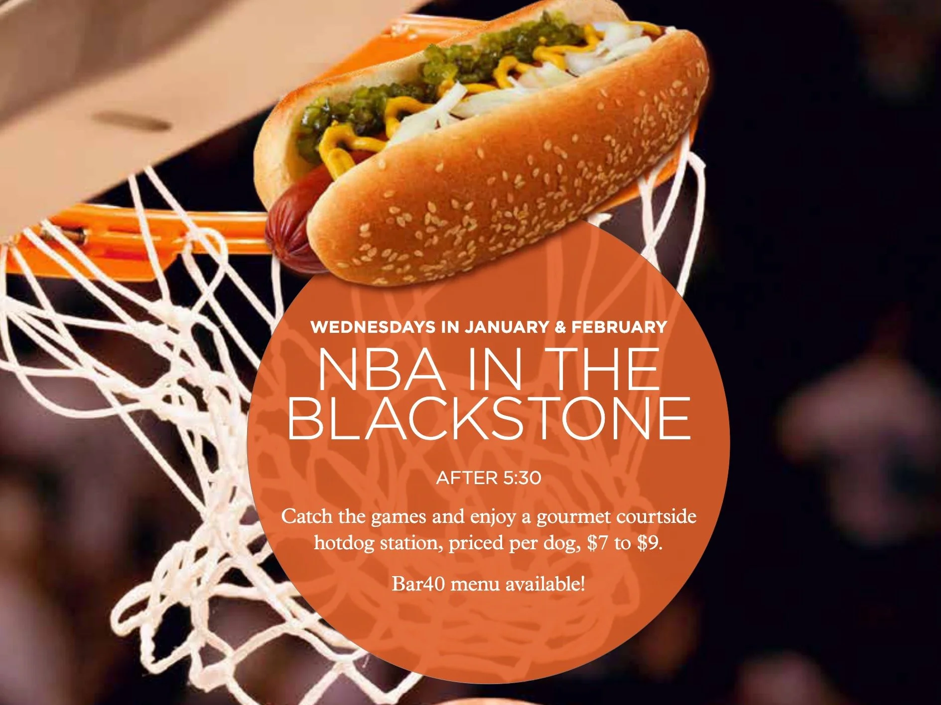 Catch the NBA action in the Blackstone while enjoying a gourmet, courtside-inspired hot dog station, priced per dog ($7–$9).The full Bar40 menu will also be available.